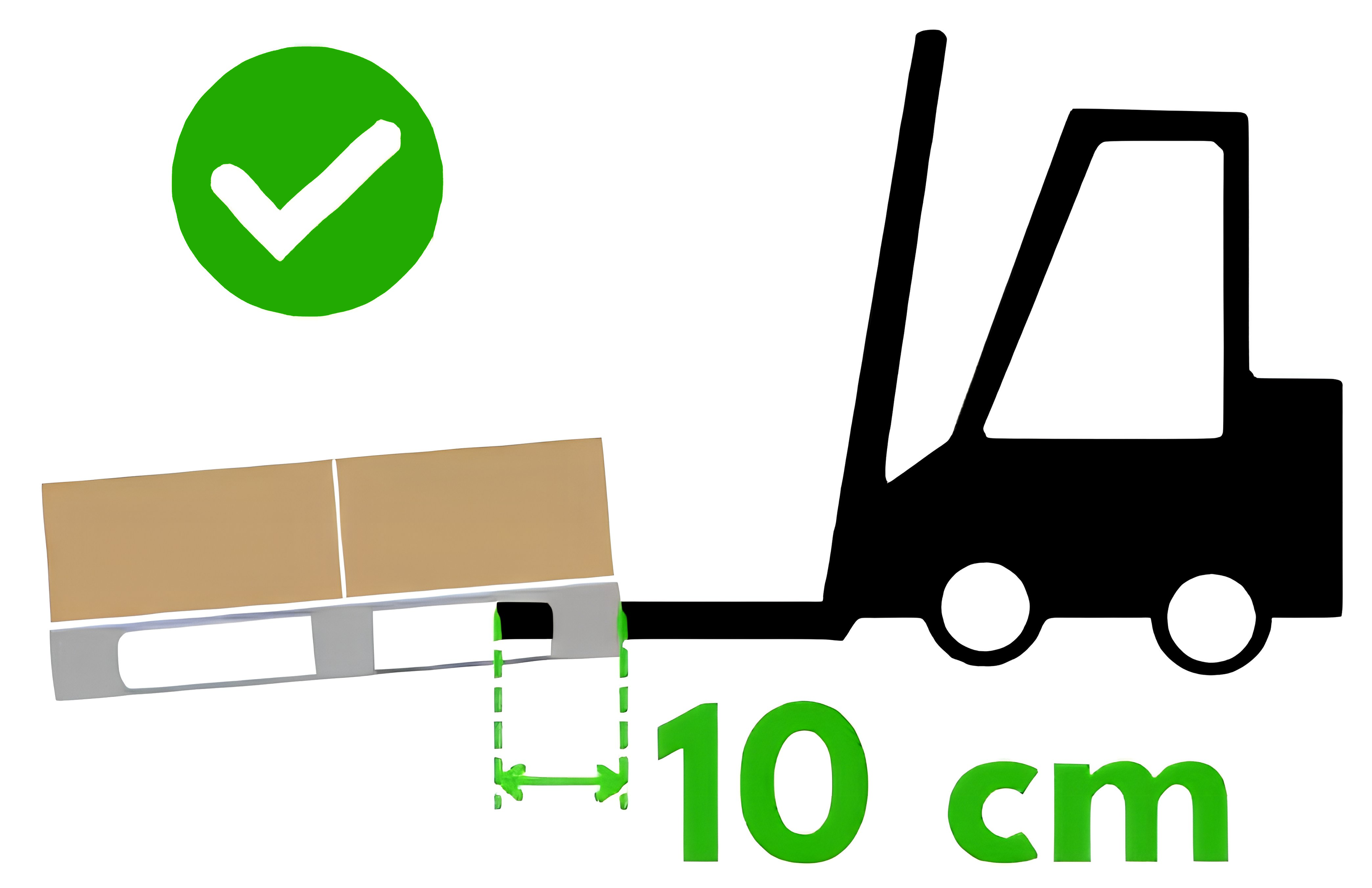 Insert forks from the short side at least 10 cm deep to prevent deformation of the top deck when repositioning the IPG Evopallet.